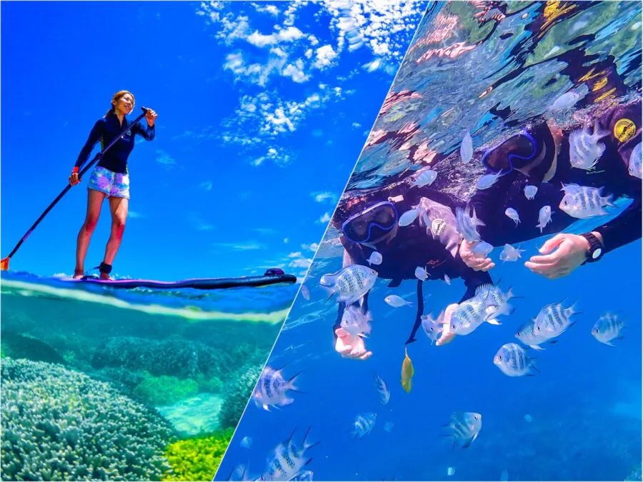 【恩納村(本島北部)/約4時間】無人島目指してSUPクルージング&シュノーケリングツアー☆写真撮影付/温水シャワー/更衣室完備/駐車場無料(No.62)